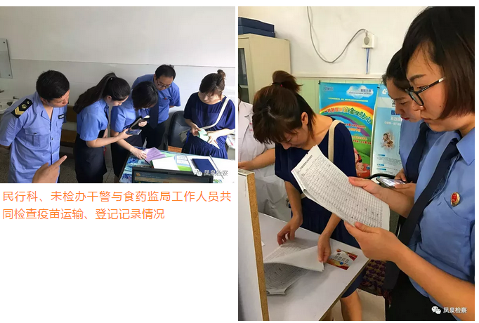 该院民行科、未检办干警同食药监局工作人员一起到凤泉区人民医院和白鹭化纤厂医院两个疫苗接种点进行检查疫苗的储存及其温度情况、疫苗使用的出入库登记记录、疫苗的流转程序、接种程序和相关管理制度是否齐全。