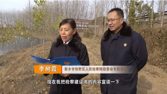 12月7日上午,在卫河西环窑场村和尚湾村段的大堤上,新乡市牧野区人民检察院的检察官神态庄严,郑重向牧野区王村镇负责人宣读 环保公益诉讼诉前检察建议。