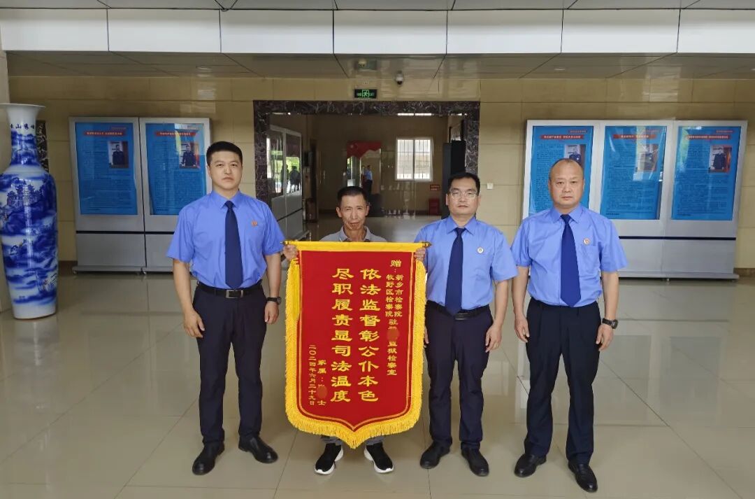 近日,服刑人员李某某家属手持一面写着“依法监督彰公仆本色 尽职履责显司法温度”的锦旗,来到卫河地区检察院驻省某监狱检察室,对检察机关所做的工作表达感谢。